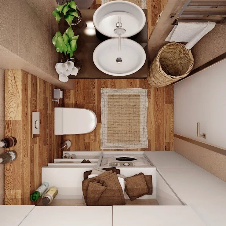 Trong những ngôi nhà nhỏ, nhà vệ sinh thường được ví như chuồng chim nhưng cũng chính vì thế mà bạn có thể nắm vững từng milimet trong không gian ấy. Thiết kế phòng tắm này đủ chỗ cho bệ toilet, bồn rửa và một bộ máy giặt. Chậu cây xanh được đặt trên bồn tắm sẽ đem thêm luồng sinh khí mới cho khoảng không gian nhỏ. Sự đồng bộ thể hiện trong từng chi tiết nhỏ nhặt từ màu sắc cho tiết chất liệu, cho thấy sự chỉn cho trong thiết kế nội thất nhà đẹp.