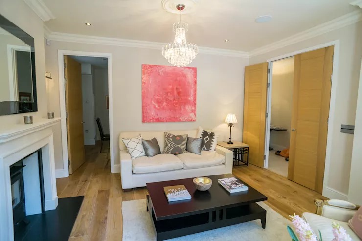 Bức tranh tường màu hồng nhạt khổ lớn trở thành tâm điểm trên bức tường trắng và các chất liệu gỗ vàng trung tính xung quanh. Chiếc đèn chùm bằng pha lê sang trọng đem đến sự tinh tế, thời thường cho phòng khách bất chấp những hạn chế về mặt diện tích.