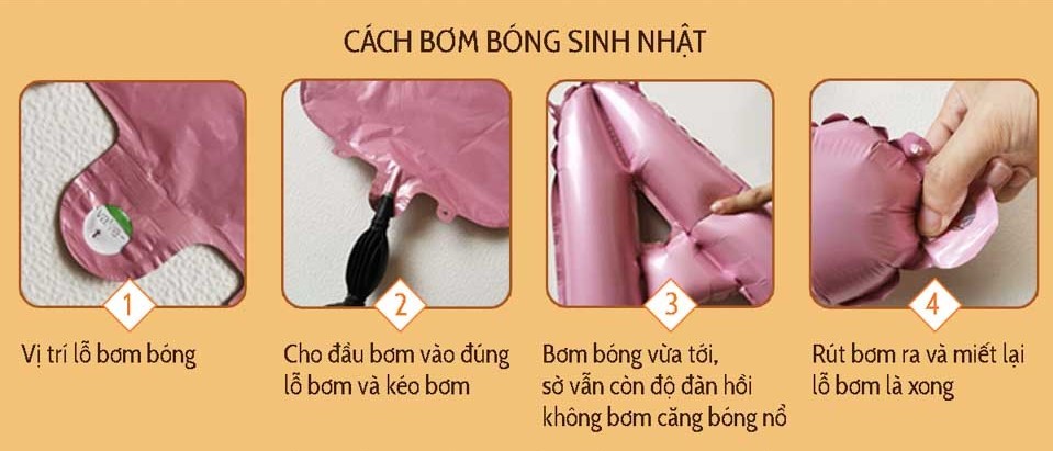 Cho đầu bơm vào đúng lỗ của bóng, kéo bơm cho bóng dần căng lên đến độ lớn phù hợp. Tiếp theo, dùng tay ấn nhẹ, nếu thấy bóng đã căng mà vẫn còn độ đàn hồi thì dừng lại, rút đầu bơm ra và miết phần đuôi bóng là xong. Khách iu nhớ chỉ bơm căng vừa tới thôi nha, không bóng sẽ dễ bị vỡ đó ạ.