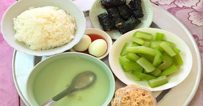 Thực đơn sau sinh 3: Cơm trắng, chả lá lốt chiên, trứng gà luộc, bí luộc + nước canh luộc, ruốc thịt thăn