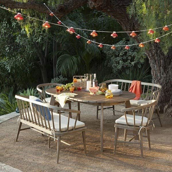 Việc kết nối những chiếc đèn có cùng kích cỡ và màu sắc thả từ cành cấy xuống dưới bàn tiệc sẽ khiến khoảng cây cỏ xanh tươi trở nên xinh tươi và ấm áp hơn.
