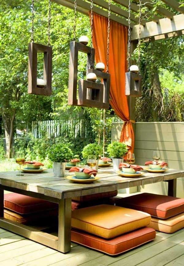 Thả các khung gỗ xuống phía dưới bàn ghế ăn ở phía trước hiên nhà. Khoảng diện tích này tuy nhỏ những vẫn sẽ trở nên ấm cũng và bắt mắt nếu bạn biết phối hợp màu sắc của các thiết bị nội thất với phụ kiện trang trí.
