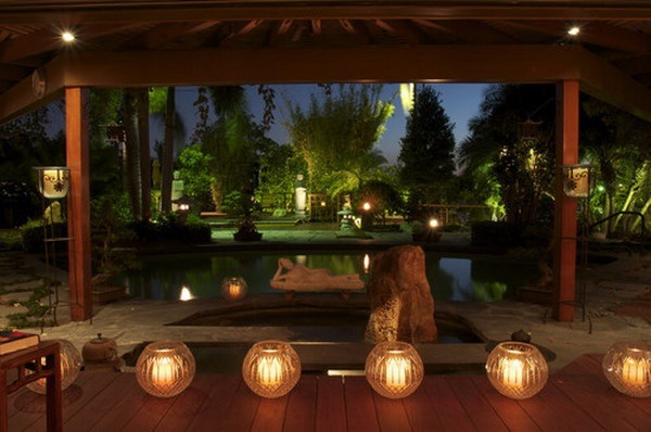 Nếu sân vườn nhà bạn có bể bơi, hãy lên ý tưởng thiết kế hệ thống đèn hắt chiếu sáng xuống mặt nước. Mặt nước trong lấp lánh ánh đèn sẽ giúp không gian thêm lung linh và đẹp dịu dàng hơn trong những ngày xuân đầu năm.