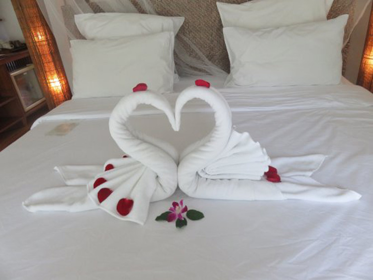 Cũng đừng quên đôi uyên ương được gấp bằng khăn tắm biểu tượng cho tình yêu đôi lứa nồng nàn trong ngày cưới.